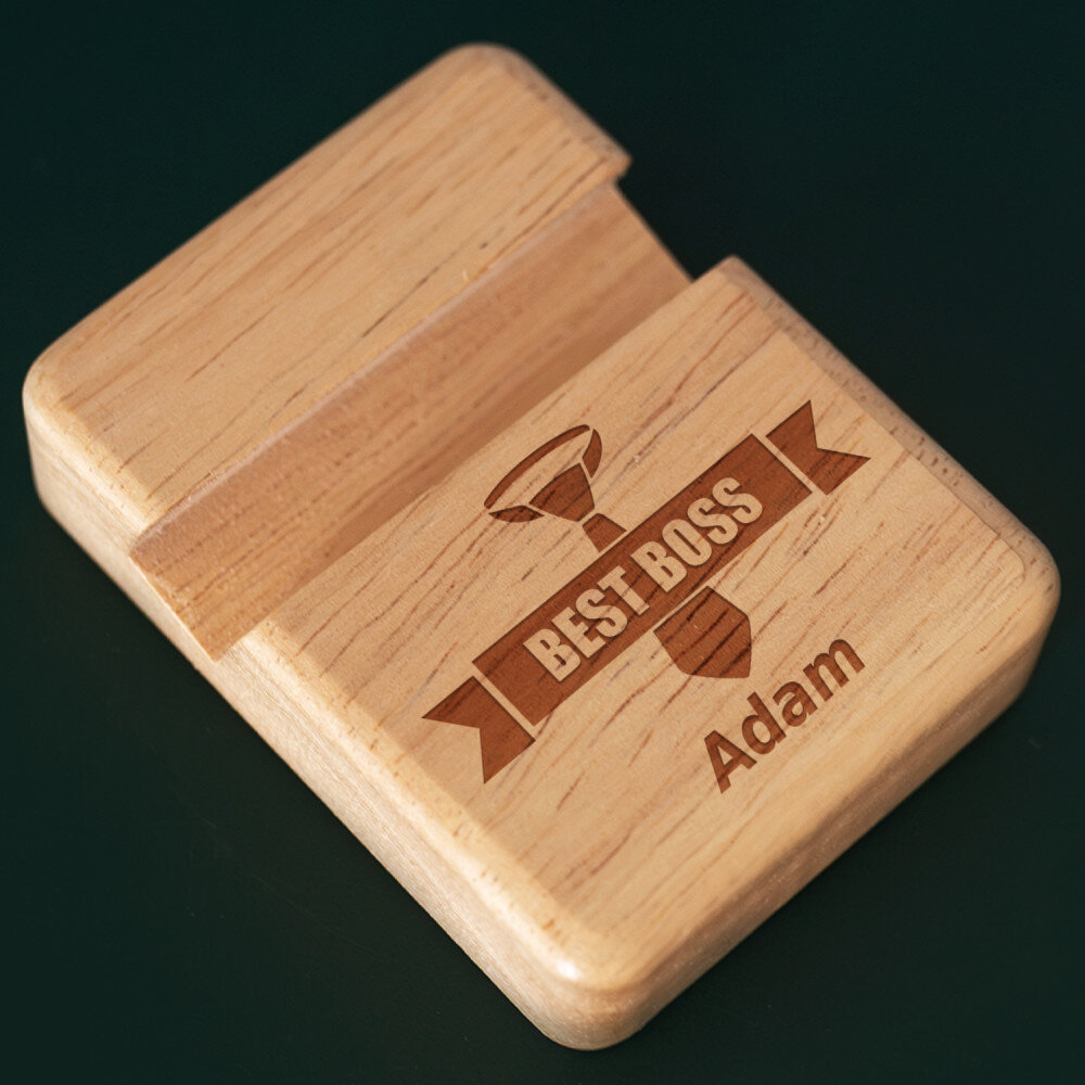 Ein Bambusständer mit einer effektvollen Gravur ist ein cooles und praktisches Telefonzubehör. Die richtig angepasste Form des Griffs ermöglicht es Ihnen, das Telefon sowohl in einer vertikalen als auch in einer horizontalen Position zu platzieren. Der Ständer hat eine natürliche Holzfarbe und sein minimalistischer Stil passt zu jedem Schreibtisch.Maße: 80 x 60 x 20 mm