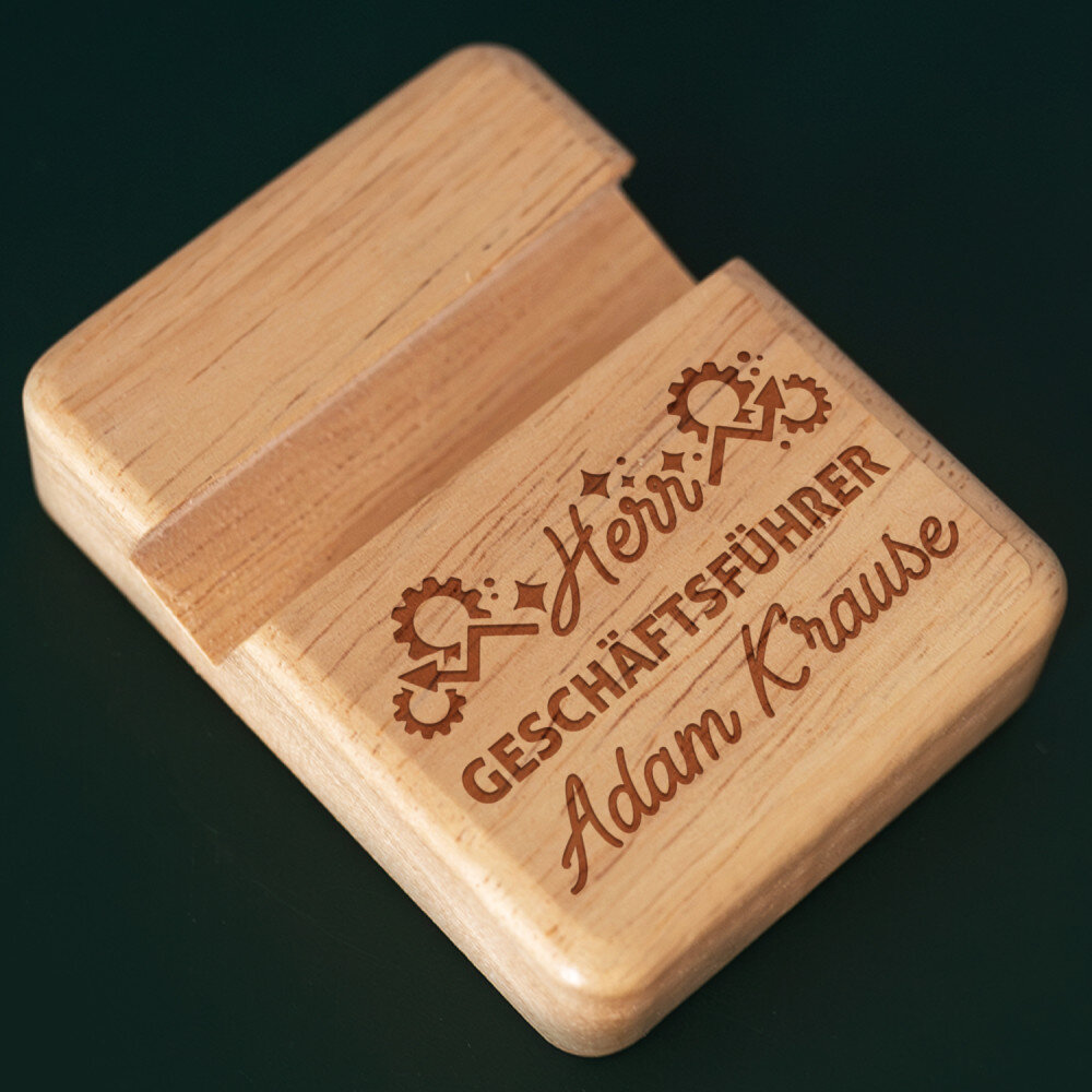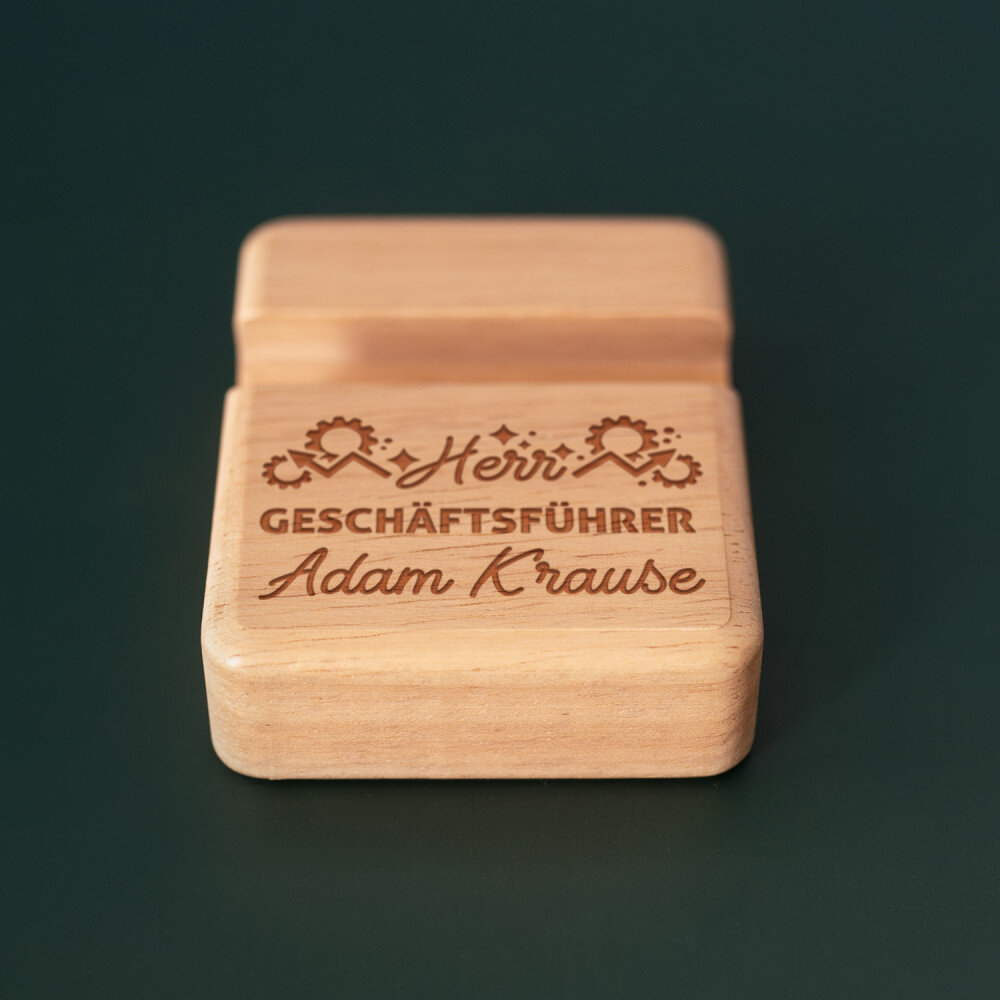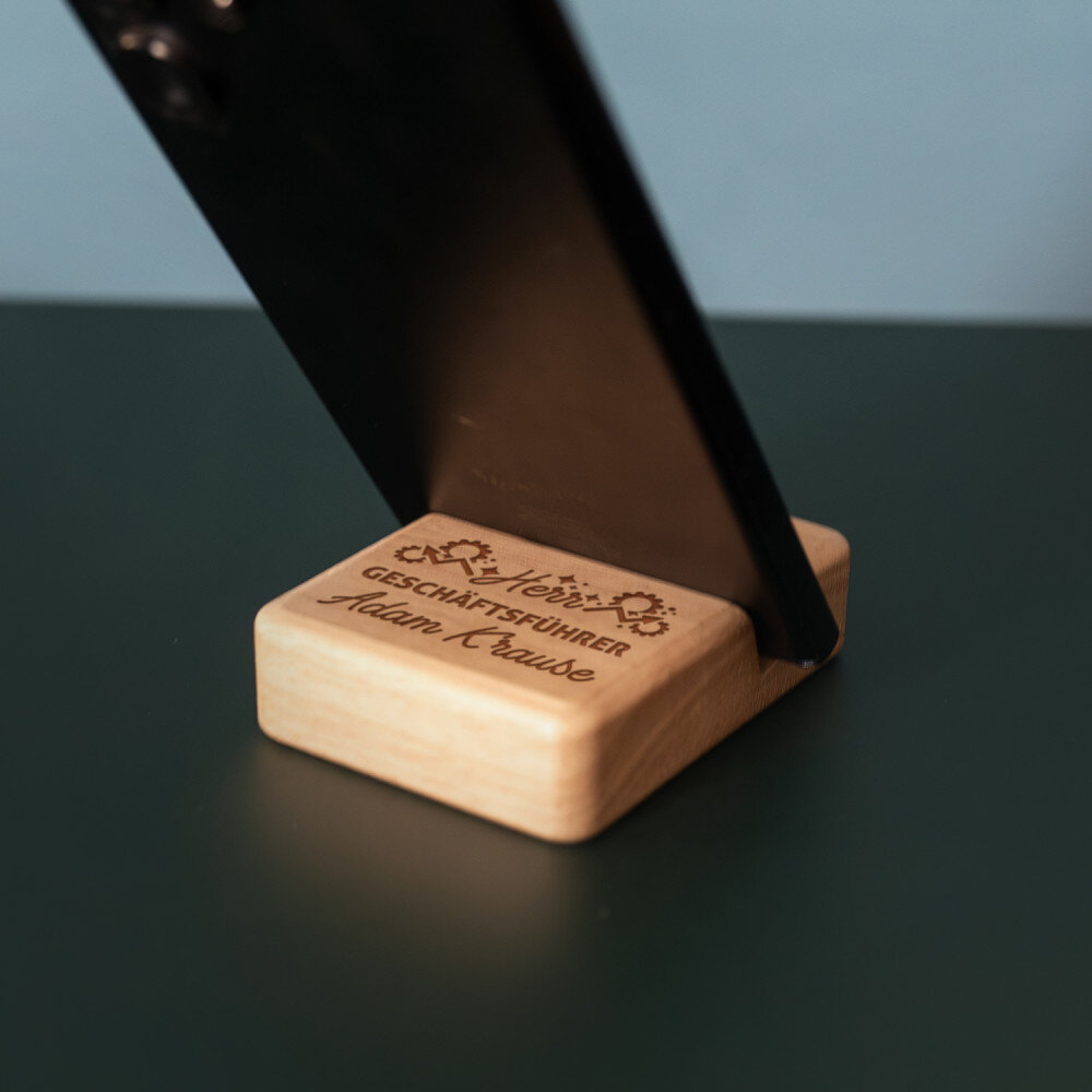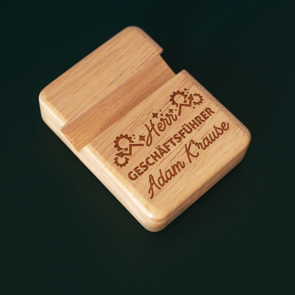 Ein Bambusständer mit einer effektvollen Gravur ist ein cooles und praktisches Telefonzubehör. Die richtig angepasste Form des Griffs ermöglicht es Ihnen, das Telefon sowohl in einer vertikalen als auch in einer horizontalen Position zu platzieren. Der Ständer hat eine natürliche Holzfarbe und sein minimalistischer Stil passt zu jedem Schreibtisch.Maße: 80 x 60 x 20 mm