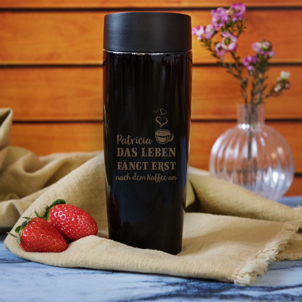 Thermobecher, Fassungsvermögen: 320ml, Größe: 19,2 x 7,2 cm.Innenseite - zwei Wände aus rostfreiem Stahl mit Vakuum dazwischen. Außenseite - metallischer Kunststoff in Schwarz mit personalisierbarer Gravur. Der Becher enthält ein Plastik-Deckelchen mit push open/close-Funktion.