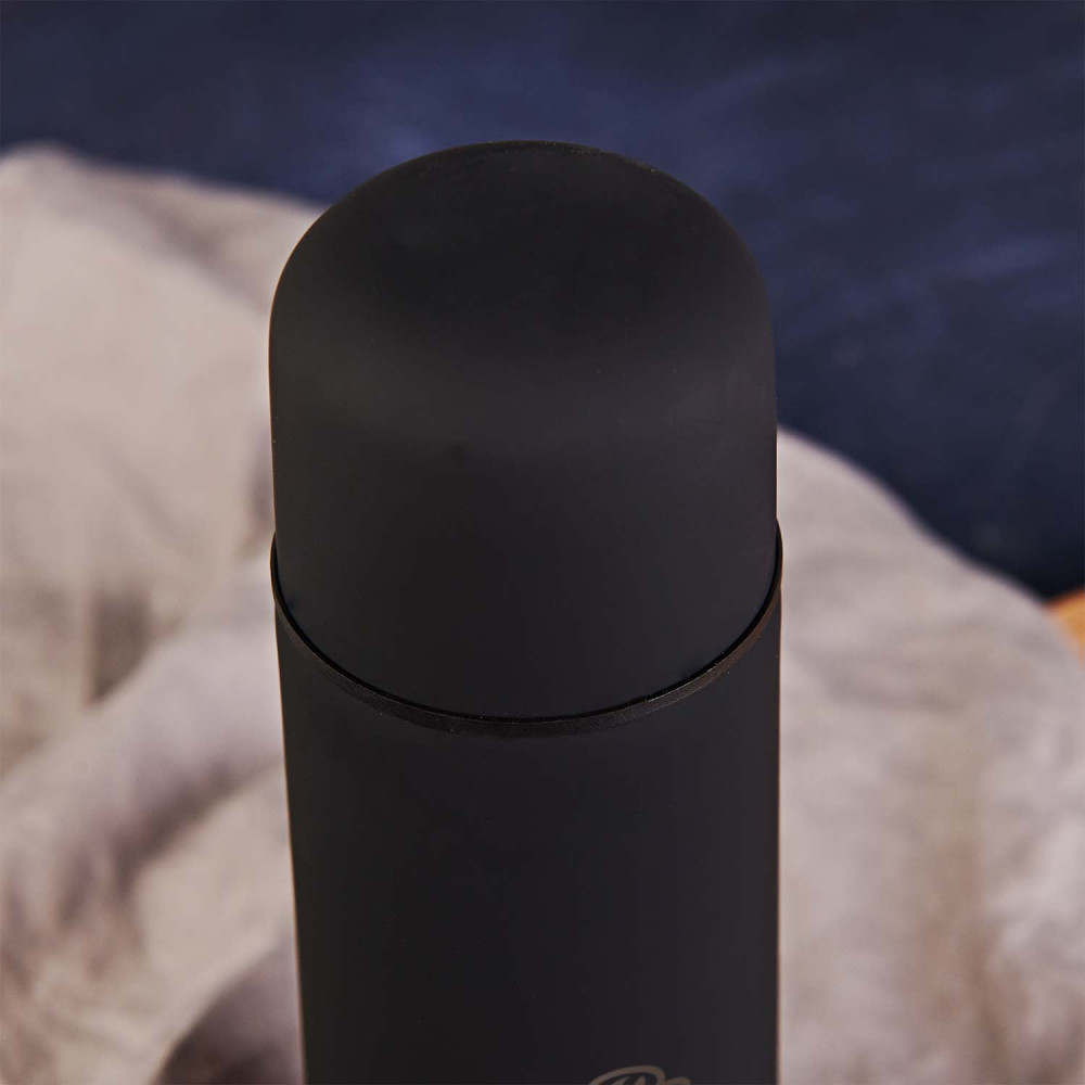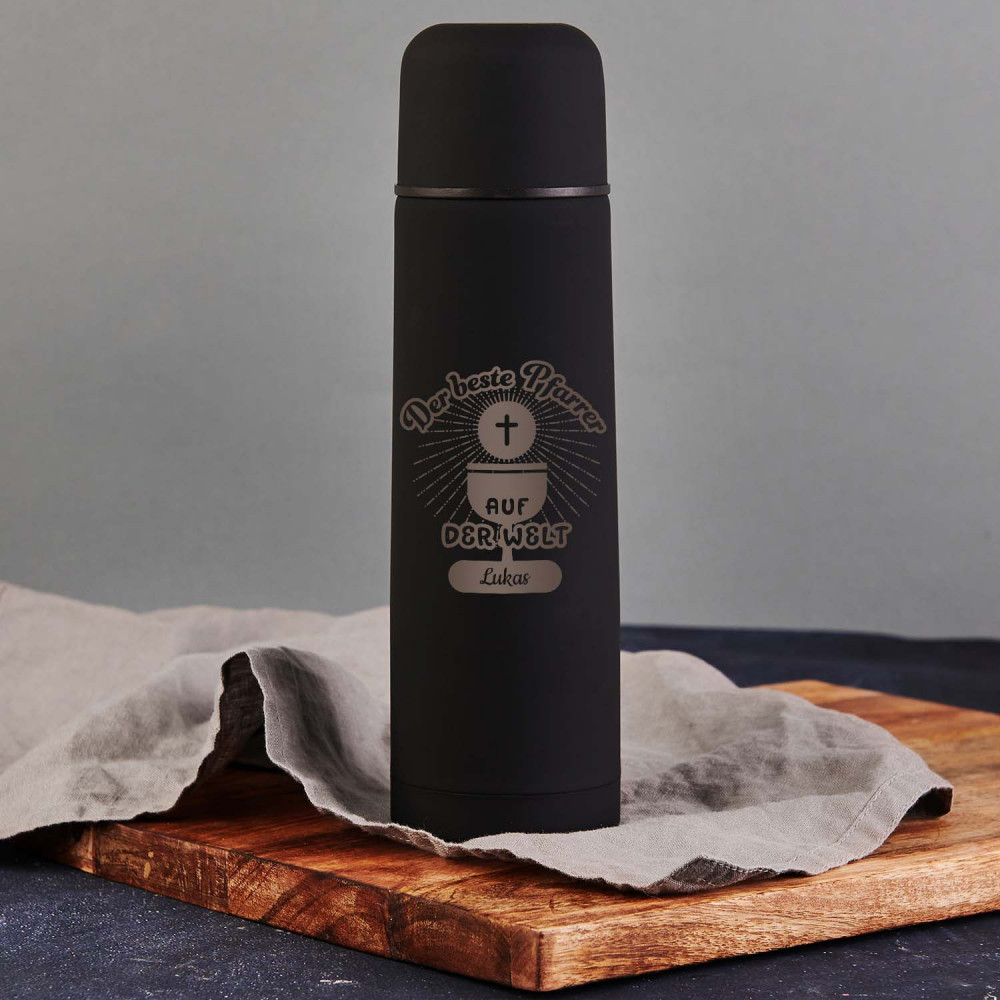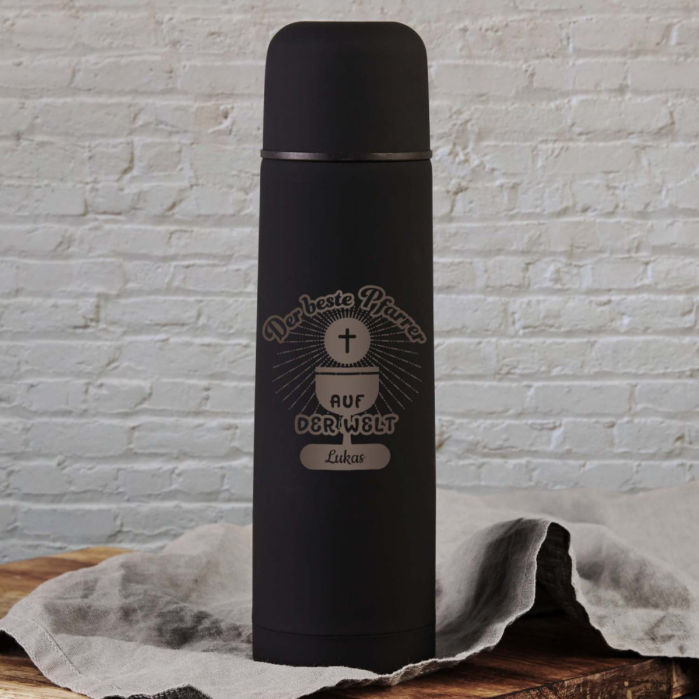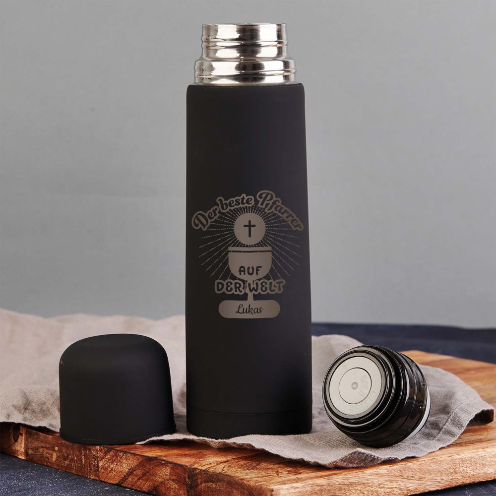 Eine solide und dichte Thermoskanne aus Edelstahl ist doppelwandig und vakuumisoliert. Das Design sorgt für bequemen Gebrauch und Schutz vor dem Verschütten des Getränks. Auf der Außenseite der Thermoskanne befindet sich eine Gummierung auf der wir eine personalisierte Gravur platzieren. Es ist ein sehr nützliches und schönes Geschenk, das jedem gefallen wird! Die Thermoskanne ist in Schwarz.Fassungsvermögen: 500 ml