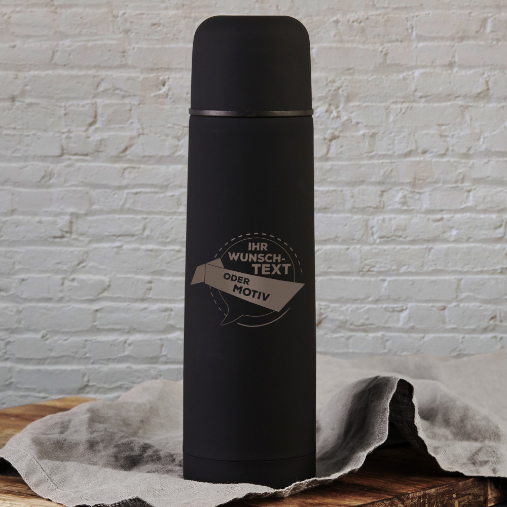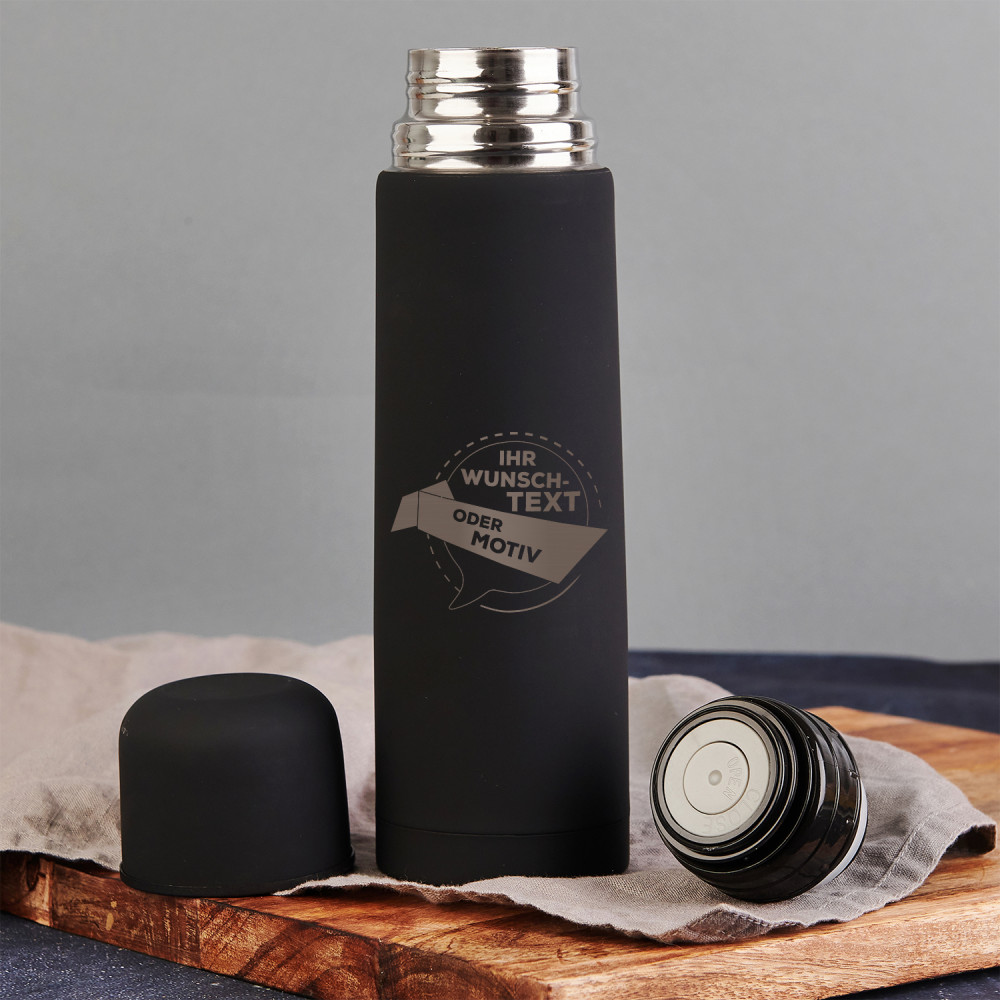 Eine solide und dichte Thermoskanne aus Edelstahl ist doppelwandig und vakuumisoliert. Das Design sorgt für bequemen Gebrauch und Schutz vor dem Verschütten des Getränks . Auf der Außenseite der Thermoskanne befindet sich eine Gummierung auf der wir eine personalisierte Gravur platzieren. Es ist ein sehr nützliches und schönes Geschenk, das jedem gefallen wird! Die Thermoskanne ist in Schwarz .Fassungsvermögen: 500 ml