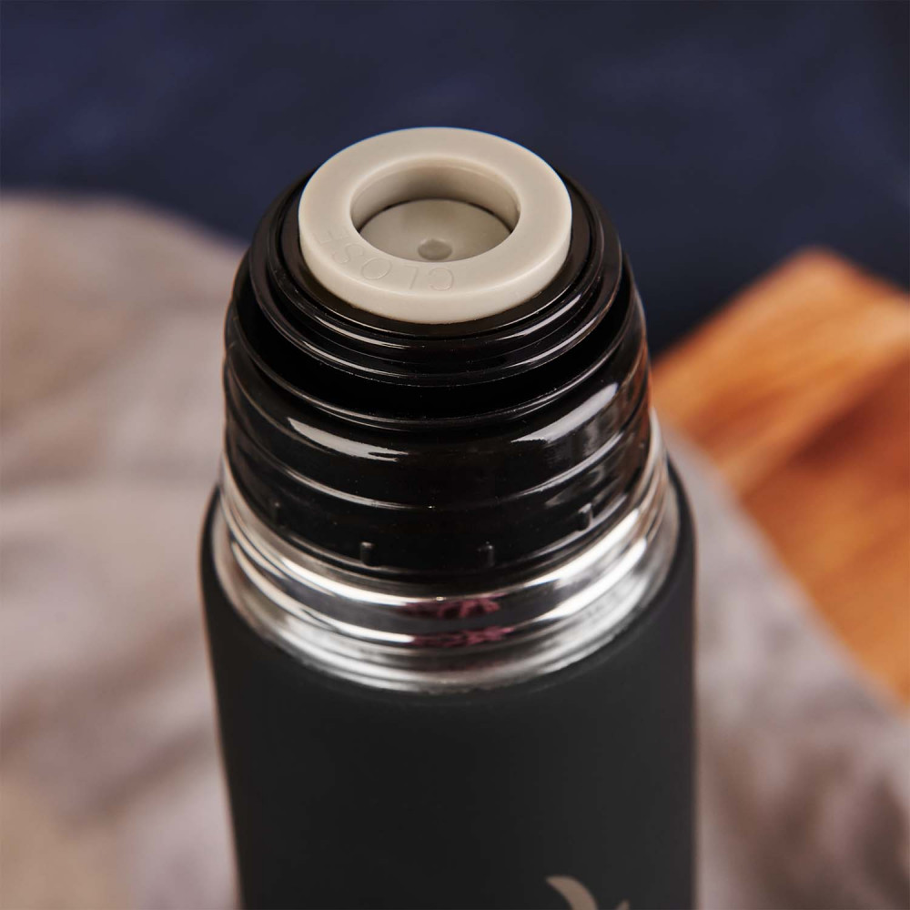 Eine solide und dichte Thermoskanne aus Edelstahl ist doppelwandig und vakuumisoliert. Das Design sorgt für bequemen Gebrauch und Schutz vor dem Verschütten des Getränks. Auf der Außenseite der Thermoskanne befindet sich eine Gummierung auf der wir eine personalisierte Gravur platzieren. Es ist ein sehr nützliches und schönes Geschenk, das jedem gefallen wird! Die Thermoskanne ist in Schwarz.Fassungsvermögen: 500 ml