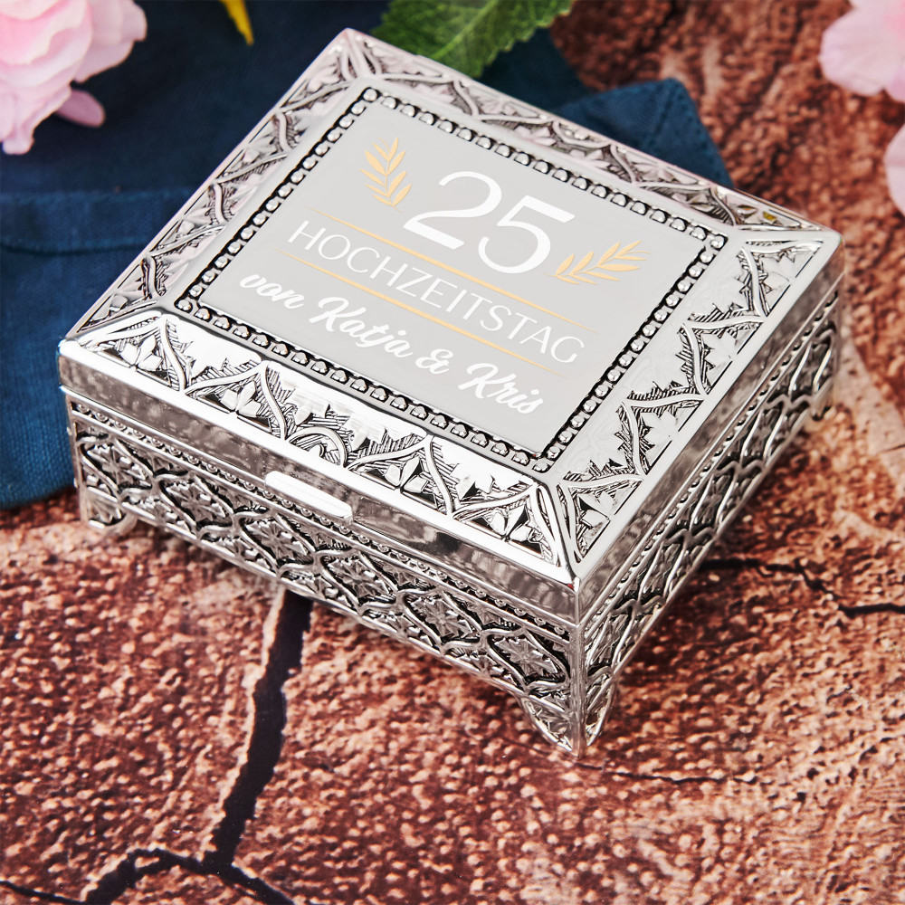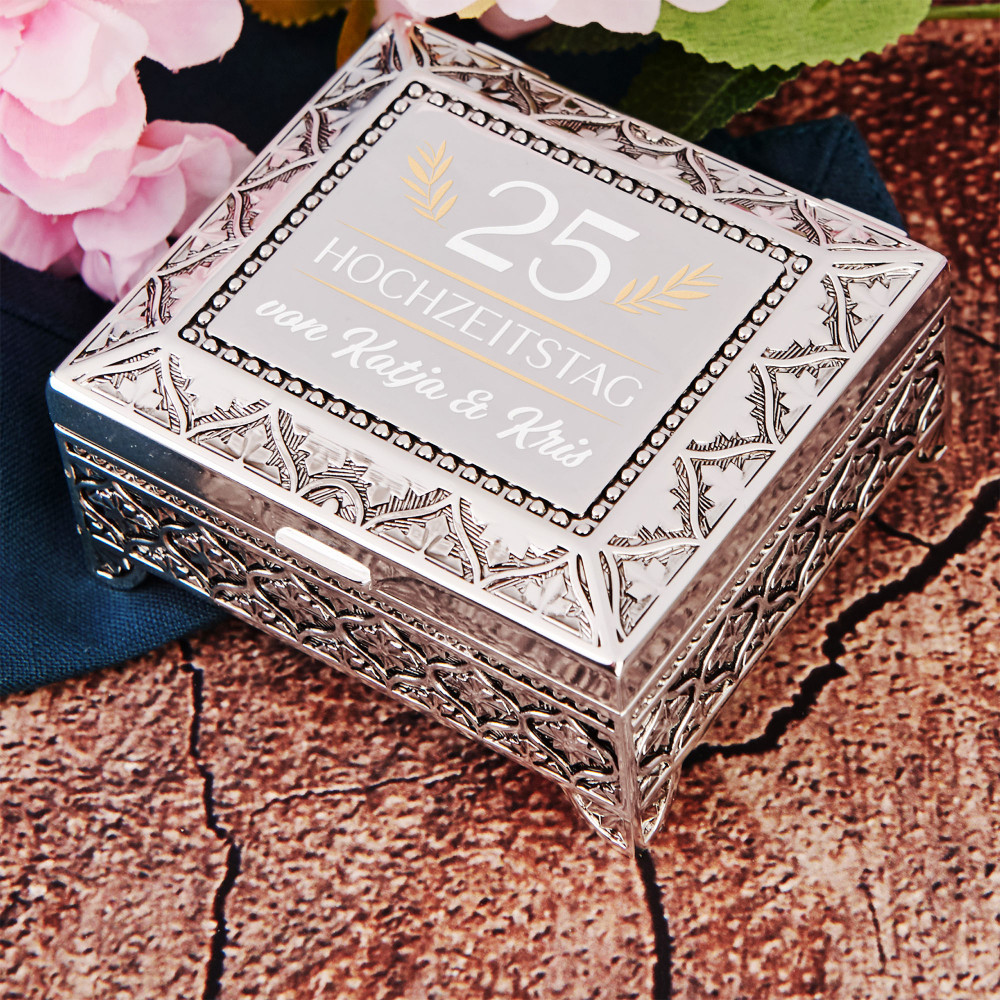 Diese versilberte Box mit Namen und Datum ist ein schönes Geschenk für wichtige Anlässe. Es drückt persönlichen Charakter und Liebe zum Detail aus.