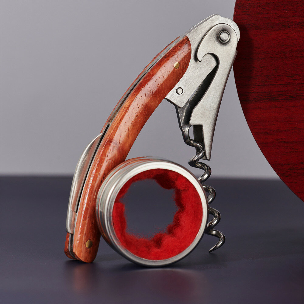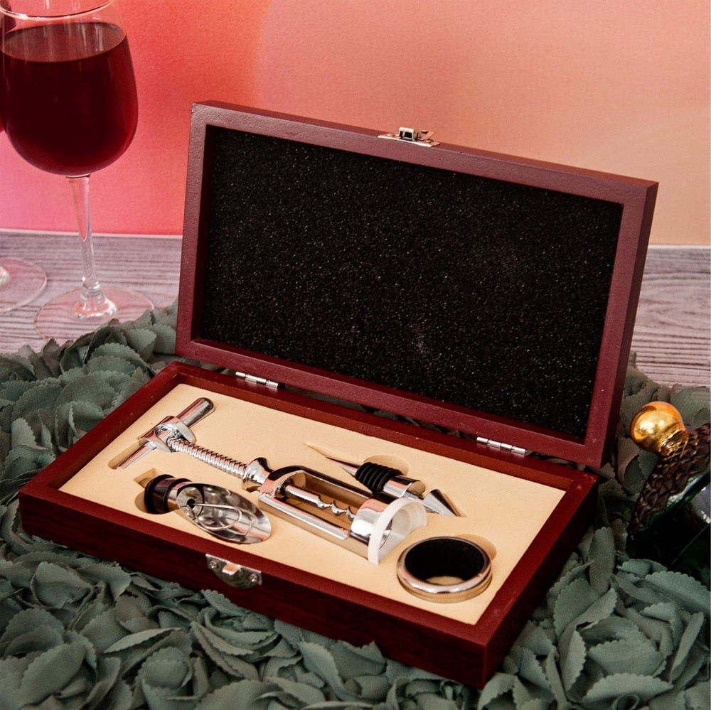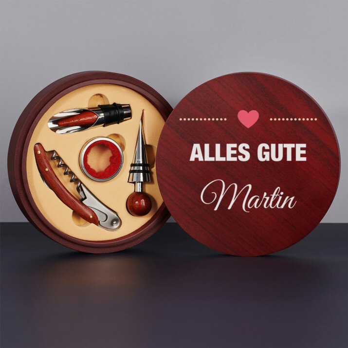 Ein schönes vierteiliges Weinset in einer eleganten Schachtel mit Aufdruck auf dem Deckel. Es stehen zwei Versionen zur Auswahl:Rechteckiges Set, bestehend aus einem Korkenzieher, 2 Stopfen (davon einer mit Ausgießfunktion) und einem Flaschenhalsring, der das Auslaufen verhindert.