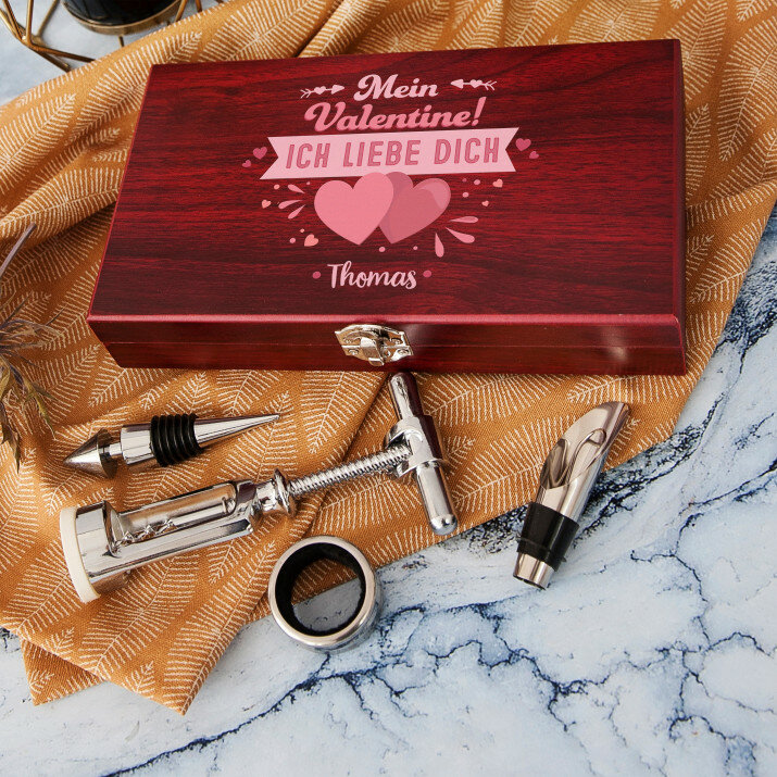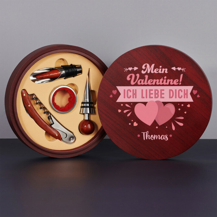 Ein schönes vierteiliges Weinset in einer eleganten Schachtel mit Aufdruck auf dem Deckel. Es stehen zwei Versionen zur Auswahl:Rechteckiges Set, bestehend aus einem Korkenzieher, 2 Stopfen (davon einer mit Ausgießfunktion) und einem Flaschenhalsring, der das Auslaufen verhindert.