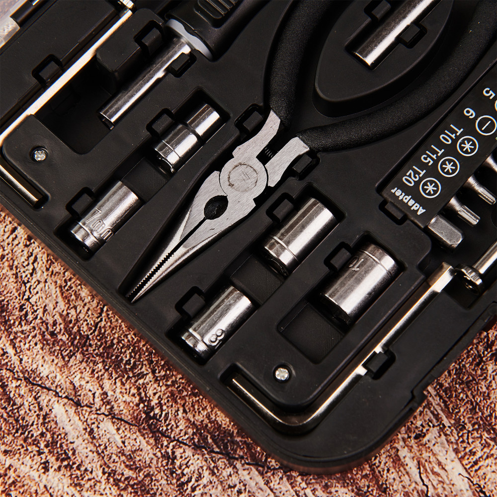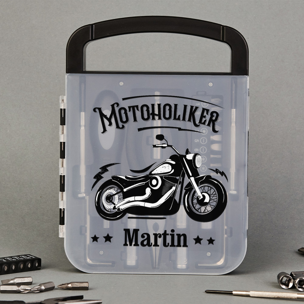 22-teiliges Werkzeugset im geschlossenen Kunststoffkoffer mit praktischem Tragegriff. Das Set beinhaltet unter anderem Schraubendreher mit auswechselbaren Bits, Zangen, Meißeln und Steckschlüsseln. Dank des kompakten Koffers können Sie Ihr handliches Set überall hin mitnehmen und kein Mangel wird Sie überraschen! Der Koffer ist schwarz und auf dem Deckel befindet sich ein personalisierter, bunter Druck. Ein solches Geschenk wird jedem nützlich sein!Maße: 220 x 160 x 27 mm